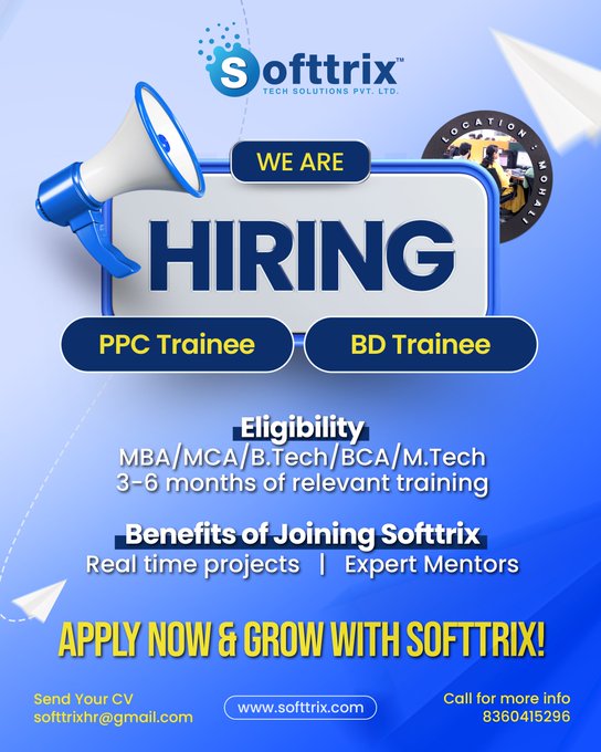 @softtrix Step into success with Softtrix!π Join us as a PPC or BD Trainee and unlock endless growth opportunities. Donβt miss your chance β apply today!π· Visit: https://t.co/YmJmwj2DMi #WeAreHiring #CareerGrowthsofttrix.comYmJmwj2DMi #WeAreHiring #CareerGrowth 5mrniUlNGO